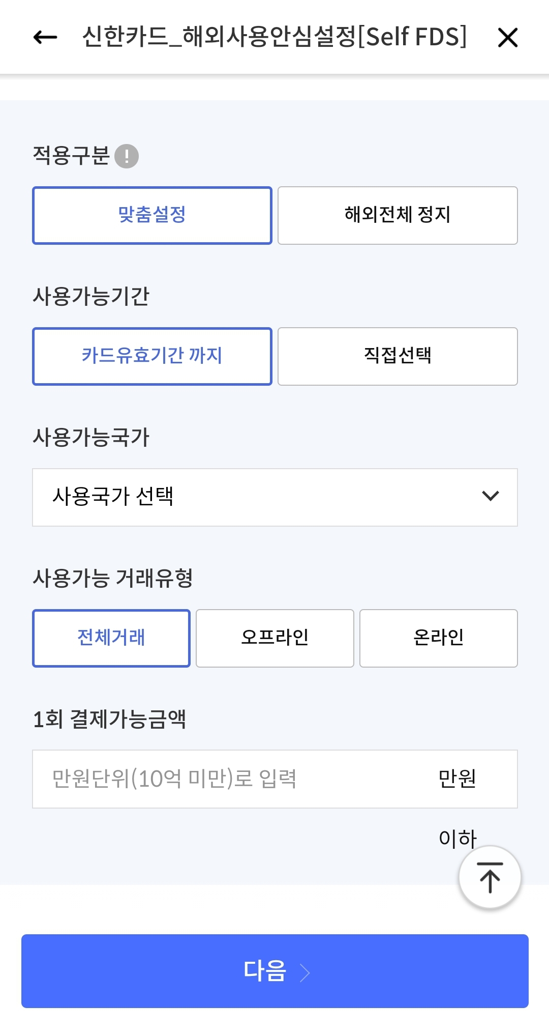 3. 신한카드의 경우, 사용가능국가와 사용가능기간, 1회 결제가능금액 등 자유롭게 맞춤설정이 가능합니다. 원하는 설정을 선택하여 본인인증을 하면 해외결제가 차단됩니다.