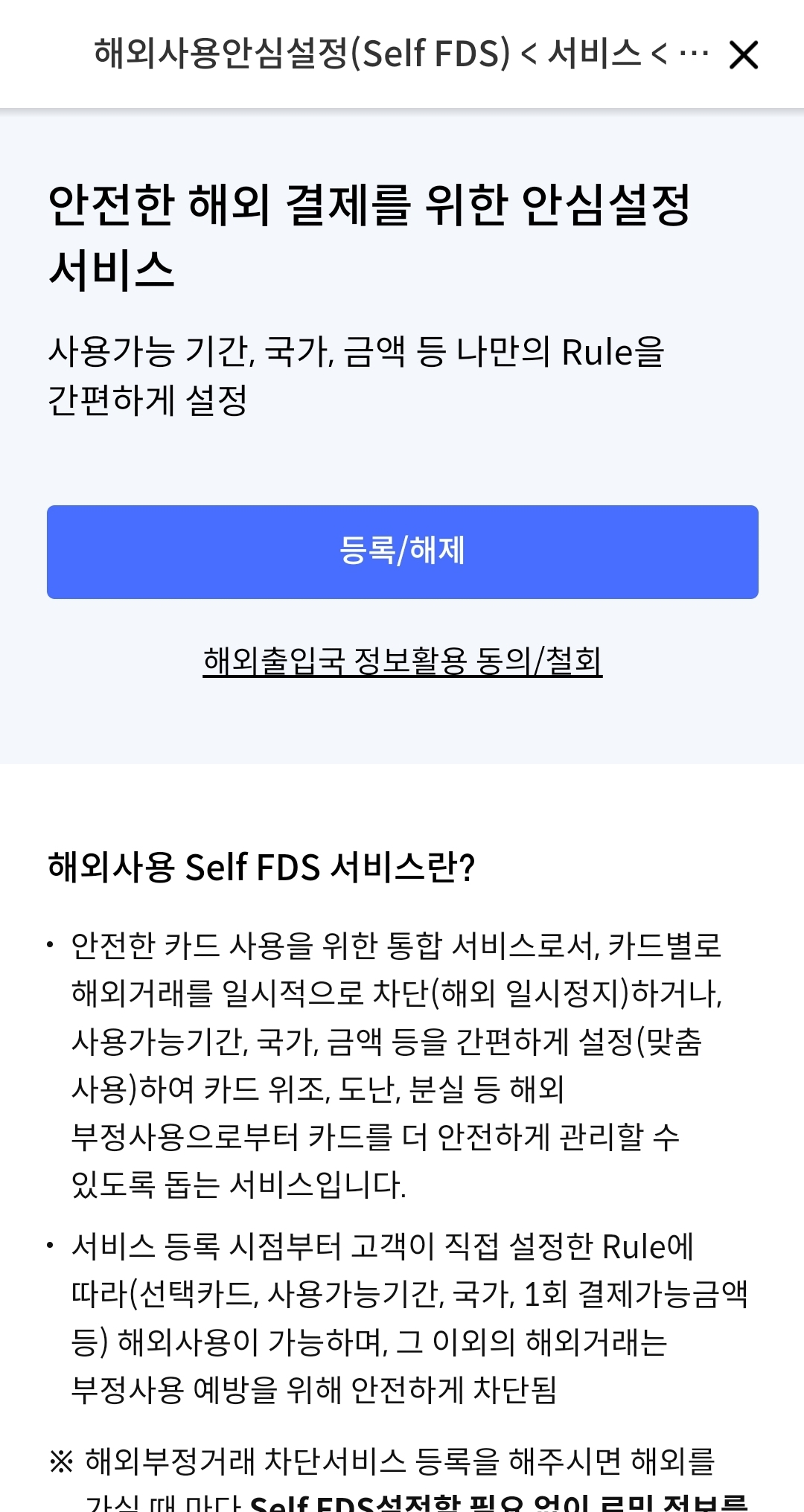 해외에서 원화 결제 시 추가로 부과되는 수수료를 막기 위해 사전에 차단하는 서비스입니다. 카드번호별로 신청하는 것으로 카드가 여러 개일 경우엔 각각 신청해야합니다. 일부 원화 승인이 필요한 곳에서는 결제가 차단될 수 있으니 유의 해야합니다. 해외 원화 결제 차단 여부와 상관없이 국내 이용은 정상적으로 가능합니다.