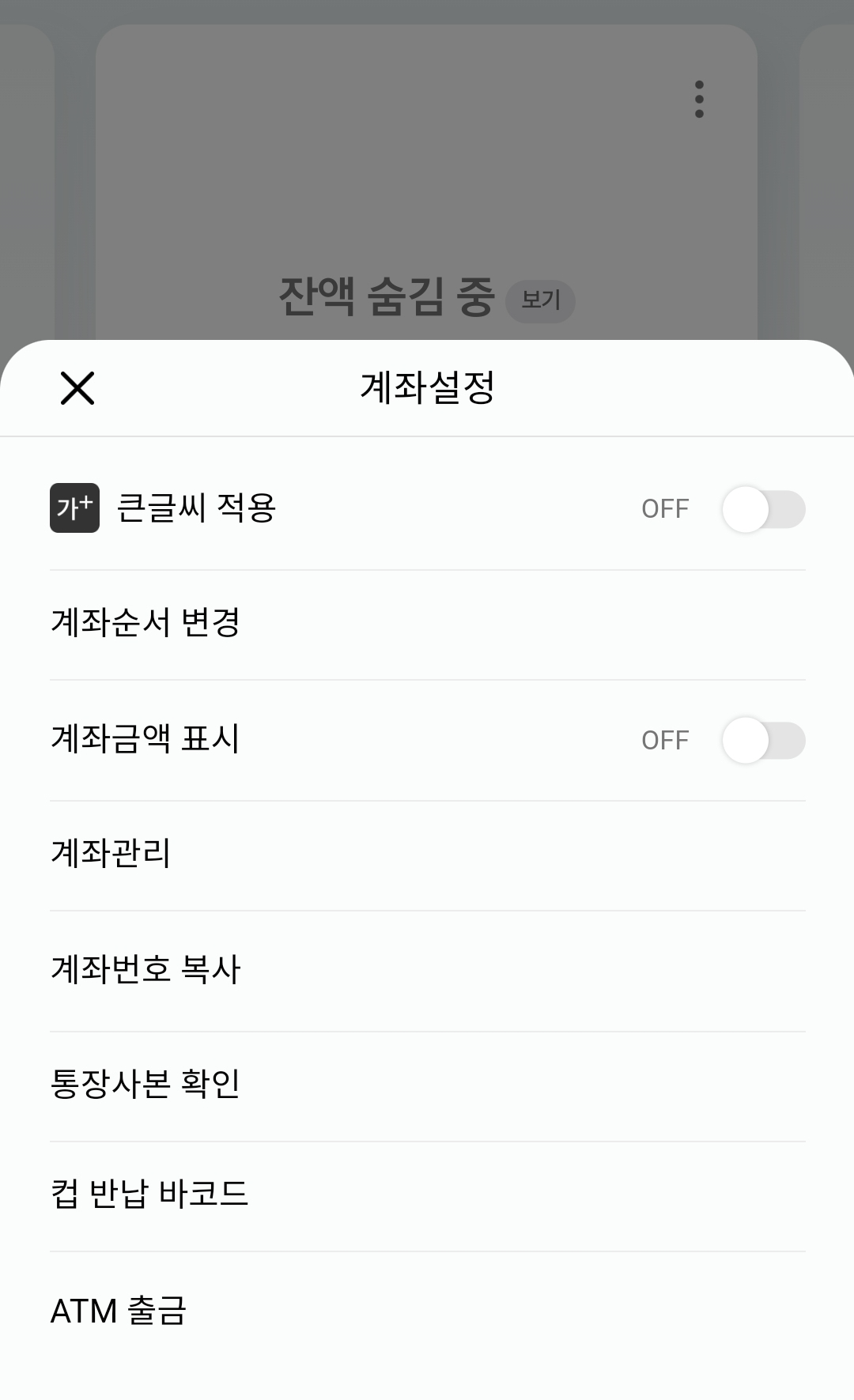 1. 홈화면에서 출금하고자 하는 계좌의 오른쪽 상단의 점 3개를 선택한 후 'ATM출금'을 선택합니다.