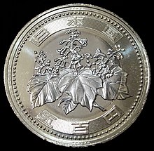 이 동전도 가운데에 구멍이 있으며, 니켈로 만들어져 은색을 띱니다. 뒷면에는 국화가 그려져 있습니다.