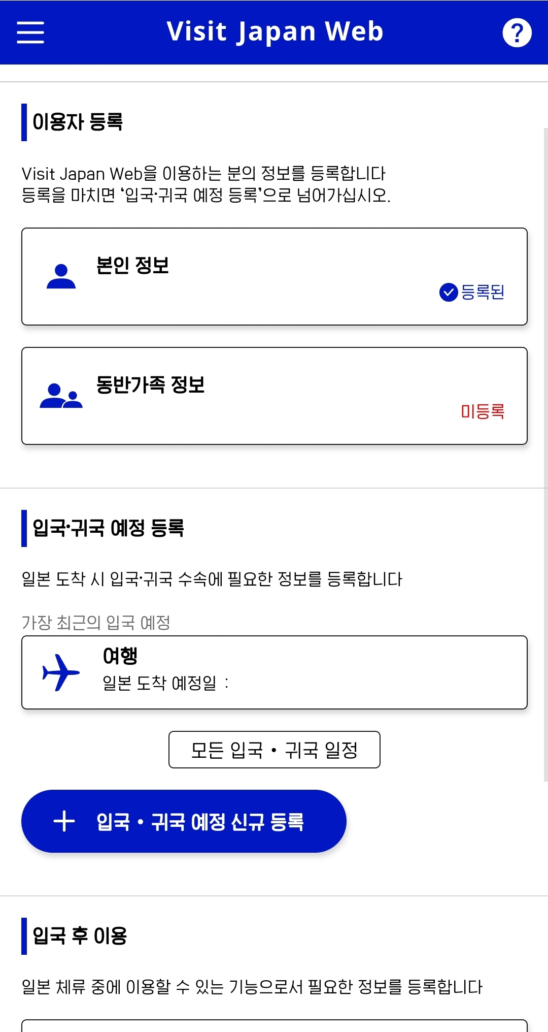4. 입국, 귀국 예정 등록에서 '신규 등록'을 통해 여행 정보를 등록합니다.